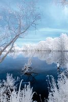 Infraroodfoto van de Vogelspotplaats in de Carnisse Grienden in Barendrecht. Witte bomen en windveren in de lucht.