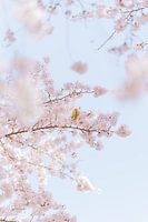 Een vogeltje in de bloesembomen, heerlijk aan het knabbelen aan de blaadjes