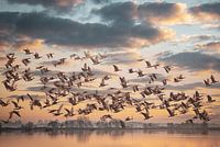overvliegende ganzen tijdens zonsopkomst. Een oorverdovend geluid van de ganzen komt je tegemoet.