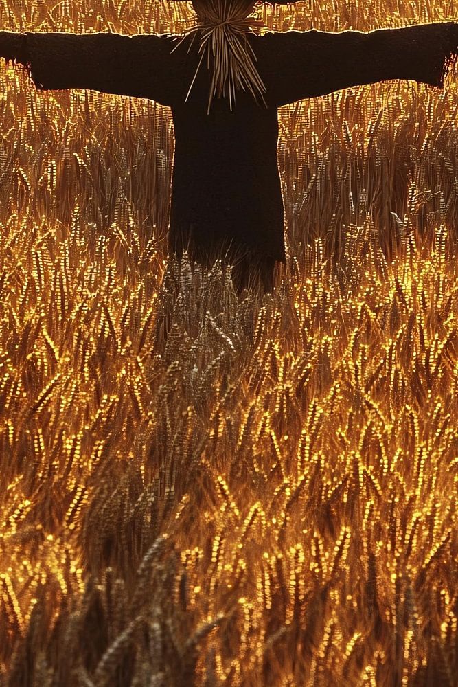 Dit prachtige ontwerp toont een zonovergoten graanveld waarin een vogelverschrikker centraal staat. De warme gouden en oranje tinten van het graan schitteren in het licht, wat zorgt voor een serene en rustgevende sfeer. De vogelverschrikker met zijn brede hoed en uitgestrekte armen lijkt het veld te bewaken, terwijl de zon het hele tafereel een magische gloed geeft. Dit ontwerp is perfect voor wie een stukje landelijke rust en natuurlijke schoonheid in huis wil halen. Het geeft een nostalgisch gevoel en brengt de betovering van het platteland tot leven in elke kamer.