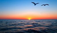 De hemel baadt in zachte gradaties van oranje en blauw, waarbij de horizon bijna onmerkbaar overgaat van de dag naar de nacht. De zon hangt als een vuurrode bol laag boven het wateroppervlak, slechts een streepje van zijn aanwezigheid tonend alvorens onder te duiken in de diepte van de oceaan. Het water, met subtiele rimpelingen en zachte golven, reflecteert de laatste zonnestralen en creëert een pad van licht dat naar het onbekende leidt.