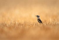 Een sierlijke vogel zit rustig op het vertakte, bruine gras, omgeven door een serene gloed van zacht zonlicht. De takken vormen een natuurlijk kader voor dit vredige tafereel.