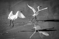 Twee kraanvogels strijdend om een plekje in opgedroogde rivier