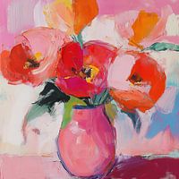 Vol kleur is een expressief schilderij dat de intensiteit en rijkdom van het bestaan verbeeldt via een uitbundig boeket bloemen. Het werk balanceert tussen figuratie en abstractie: de vaas en bloemen zijn herkenbaar, maar niet vastgelegd in detail. Ze ontstaan uit krachtige penseelstreken en overlappende kleurvlakken, alsof het leven…