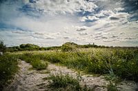 De strandwegen in Denemarken duiken zo ineens op. Kijken naar de mooi blauwe lucht met zijn geweldige groene grasbloemen in de zon.
