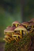 Een groepje paddenstoelen die aan de zijkant van een bemoste boomstam groeit.