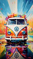 De levendige kleuren en de kenmerkende rondingen en karakteristieke details van de T1 worden geaccentueerd, waardoor het voertuig bijna tot leven komt op de muur. De achtergrond is een explosie van kleur en patronen, die doen denken aan de vrijgevochten geest van de jaren '60 en '70, toen de Volkswagen Bus T1 een symbool werd van avontuur en counterculture. De psychedelische motieven en vloeiende lijnen vormen een harmonieus geheel met het busje, en creëren een visueel feest dat zowel energie als rust uitstraalt.