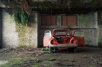 Een rode Volkswagen Kever die is achtergelaten in een oude garage. Te zien is hoe de natuur de garage langzaam overneemt.