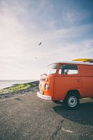 Foto van een oranje Volkwagen bus aan het strand met een surfplank op het dak.