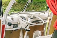 Volkswagen Transporter T1-camper dashboard met open deuren geparkeerd in een park. De Volkswagen Transporter is een populaire bestelwagen om als camper te gebruiken en werd oorspronkelijk als een camper afgeleverd, maar veel zijn later omgebouwd.