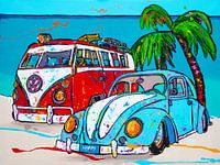 Een kleurrijke Volkswagen transporter en een kever samen op het strand van de kunstenaar Renate Rolefes.