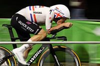 Deze foto vangt een intens moment uit de wielersport: een renner volledig in aerodynamische houding tijdens een tijdrit. Het lichaam is strak gespannen boven de fiets, de armen rusten stabiel op het stuur en de blik is onverzettelijk vooruit gericht. Alles aan dit beeld ademt snelheid, concentratie en pure kracht.
