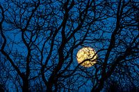 Een volle maan verbergt zich achter een winterse boom. De ronde bol schijnt door de takken.