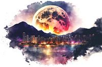 Dit waterverf schilderij van Hongkong toont de stad op het moment dat de avond valt. De verlichte gebouwen langs de waterlijn vormen een prachtig contrast met de donkere lucht. Deze felle lichtjes geven de stad een pulserende en dynamische uitstraling. In de achtergrond is de volle maan zichtbaar, die een zacht licht over de stad werpt. Dit geeft het schilderij een bijna magische sfeer, alsof de nachtelijke stad een eigen leven leidt. De waterverftechniek geeft de afbeelding een soepele en organische uitstraling, die perfect past bij de bewegingen van het water en de verlichte gebouwen. Het resultaat is een prachtig schilderij van een stad in volle bloei, vol beweging en verlichting.