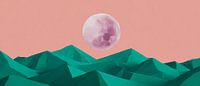 Een zachtroze kleurverloop omlijst de majestueuze maanschijf, die boven gestileerde groene bergen zweeft. Deze harmonieuze compositie is zowel rustgevend als inspirerend, ideaal voor een slaapkamer of een creatieve ruimte waar dromen en ideeën de vrije loop kunnen gaan. Een echte blikvanger die rust brengt in elke hoek.