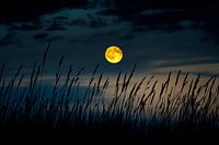 Een stralende volle maan staat majestueus aan de hemel en baadt het tafereel in een zacht, gouden licht. Donkere silhouetten van hoog gras lijken te dansen in de wind, terwijl de nachtelijke hemel is versierd met mysterieuze wolken. Er hangt een stille magie in de lucht, alsof de natuur de nacht omarmt.
