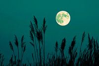 Een zachte, zilveren gloed hult het landschap in een mysterieuze rust, terwijl de vollemaansbol majestueus boven de tere silhouetten van het riet uittorent. De koele kleuren van de avond roepen een mysterieuze sfeer op waarin natuur en sterrenlicht harmonieus samengaan. Een moment van tijdloze schoonheid dat uitnodigt om te dromen.