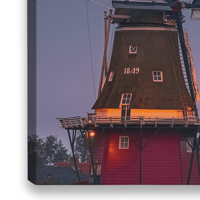 Een vierkante foto van een volle maan bij korenmolen ‘De Hoop’ in Dokkum in het noorden van Friesland. De Hoop is een achtkante stellingmolen en werd gebouwd in 1849, de molen was aanvankelijk ook ingericht als pelmolen. ‘De Hoop’ is één van de grootste molens van Dongeradeel.