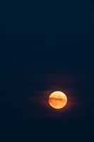 Volle maan in de zomernacht met duidelijk zichtbaar maanoppervlak en wolken die voor de oranje gekleurde maan langs trekken. Geschoten met een lange telelens.