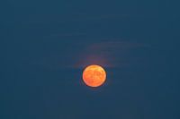 Volle maan in de zomernacht met duidelijk zichtbaar maanoppervlak en wolken die voor de oranje gekleurde maan langs trekken. Geschoten met een lange telelens.