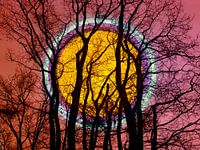 Groep bomen in het bos die een grillig silhouet vormen tegen de gele volle maan. De magie van de nacht.