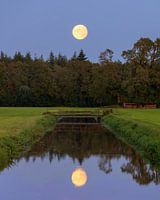 De volle maan komt op boven een beekje in het Sallandse landschap nabij Deventer. De volle maan is door de ondergaande zon mooi belicht.