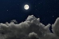 En foto van de volle maan in een heldere hemel vol met sterren. Het maanlicht schijnt op stapelwolken die deels worden opgelicht. Dit zijn taferelen die 's nachts kunnen voorkomen. Het is alleen niet vast te leggen met een camera. Dus maak ik ze zelf met drie foto's gecombineerd. Één van de Maan, één van de wolken en één van de sterren. Een zeer mooi en relevant werk voor aan de slaapkamer muur.