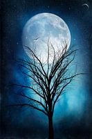 Fotocollage met een silhouet van een boom voor een volle maan en een intens blauwe nachtelijke hemel met sterren - minimalistische compositie die bijzonder geschikt is voor slaapkamers en kinderkamers.