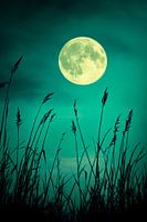 Een zilveren reus zweeft majestueus in de nachtelijke hemel, omringd door zachte, schaduwrijke grassen die dansen in de wind. De mysterieuze groene gloed geeft het landschap een dromerige sfeer, terwijl de wolken zachtjes rond de maan drijven. Mystiek en rust komen samen in deze avondmagie die je uitnodigt om te dromen.