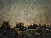 Dit fotokunstwerk toont een volle maan boven olijfgaarden bij zonsopgang in Umbrië, Italië. Het daglicht begon net het begin van de details in de olijfgaarden te tonen en de volle maan stond nog hoog aan de hemel en was zichtbaar.