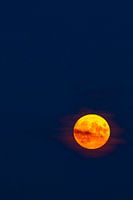Volle maan in de zomernacht met duidelijk zichtbaar maanoppervlak en enkele lichte wolken die voor de maan langs trekken. Geschoten met een lange telelens.