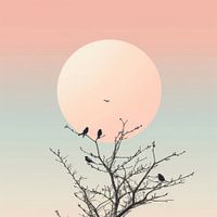 Deze vredige afbeelding van een volle maan boven een boomtop creëert een kalme en meditatieve sfeer. De delicate kleurschakeringen en de filigraan takken in combinatie met de silhouetten van de vogels geven de afbeelding een harmonieuze elegantie. Ideaal voor slaapkamers die op zoek zijn naar een ontspannen en natuurlijke decoratie.