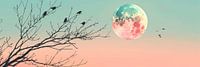 Deze vredige afbeelding van een volle maan boven een boomtop creëert een kalme en meditatieve sfeer. De delicate kleurschakeringen en de filigraan takken in combinatie met de silhouetten van de vogels geven de afbeelding een harmonieuze elegantie. Ideaal voor slaapkamers die op zoek zijn naar een ontspannen en natuurlijke decoratie.