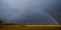 Volledige regenboog over dor moerasland met enkele boom in het midden tijdens stormachtig weer met dramatische hemel
