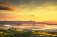 Mistig panorama van Volterra, glooiende heuvels en groene velden bij zonsondergang. Regio Toscane, Italië, Europa