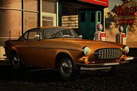 Koop dit digital art kunstwerk Volvo P1800 S Coupe uit 1961 met oldtimers Tankstation van Jan Keteleer als reproductie op canvas, aluminium dibond, (ingelijste) fotoprint, behang en ArtFrame, op maat geprint in Fine-Art kwaliteit.