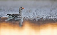 Volwassen Grauwe Gans zwemmend in een rimpelloos meer in de winter.