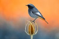 Volwassen Mannetje Zwarte Roodstaart (Phoenicurus ochruros gibraltariensis) zittend op een plant tegen een kleurrijke oranje achtergrond.