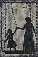 Dit krachtige ontwerp, uitgevoerd in monochrome tonen, portretteert op unieke wijze een volwassene en een kind die elkaars hand vasthouden, verbonden door grote kettingen. De Abstract, silhouet-achtige weergave, tegen een achtergrond van gescheurde en gefragmenteerde elementen, roept emoties op van verbondenheid te midden van fragmentatie en strijd. Het Minimalistisch kleurenpalet van zwart en wit benadrukt de krachtige symboliek van de verbinding en de kettingen die zowel binden als beperken, waardoor dit stuk een diepe indruk achterlaat op de kijker.