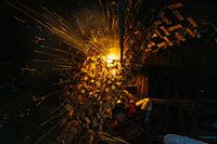 Door het lassen aan de corsowagen ontstaan er mooie vonkenregens.