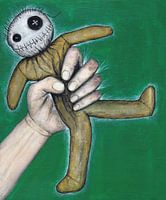 Een acrylverf schilderij van een voodoo pop die wordt fijngeknepen door een mensenhand.