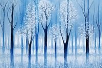 Een sereen blauw bostafereel toont slanke bomen zonder bladeren die lange schaduwen werpen op een mistige ondergrond. De harmonieuze mix van blauw creëert een kalme, mystieke sfeer die een gevoel van stilte en rust oproept.