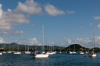 Zeilboten voor anker, in de rustige baai bij Saint-Anne op Martinique. Een zonnig eiland, een Franse provincie in de Caraïben.