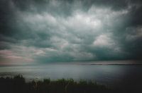 Een rustige, minimalistische landschapsfoto met een weids uitzicht over de Oostzee. Dichte wolken trekken voorbij en hullen de lucht en de zee in gedempte, koele kleuren. De foto legt de bijzondere sfeer vlak voor de regen vast – stil, weids en vol diepte. Ideaal voor een strakke, sfeervolle interieurinrichting.