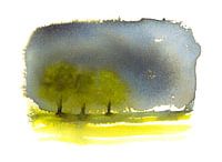 Before the storm is een abstract landschapsschilderij, geschilderd in aquarel en inkt op liggend formaat door de kunstenaar Karen Kaspar. Drie individuele bomen met groen gebladerte staan in een felgeel bloeiend koolzaadveld onder een stormachtige hemel met donkere stormwolken. Een zomerse storm is in aantocht.