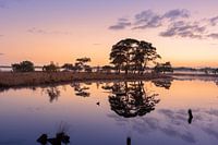 Een prachtige foto van een ven in Drenthe op het Dwingelderveld, op een windstille en mistige ochtend. Net voor zonsopgang, met een prachtige kleur in de lucht. De bomen reflecteren in het water. Net als de wolken. De foto is gemaakt in de ochtend op 25 september 2022, op het Dwingelderveld in Drenthe.
