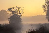 De lucht kleurt prachtig geel ; de dag zal snel beginnen. Overal om me heen is mist, een mysterieus begin van de dag. De beek meandert door het sfeervolle Drentse Aa gebied. Dit is het Oudemolensche Diep, een van de stroompjes van het Nationaal Landschap Drentsche Aa.