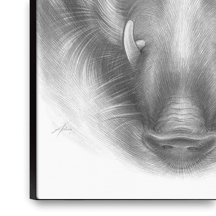 Deze gedetailleerde potloodtekening toont het gezicht van een wild zwijn en benadrukt de karakteristieke slagtanden en getextureerde vacht van het dier. De close-up legt de intense uitdrukking van het everzwijn vast. Het portret benadrukt ook de ruwe vacht en de krachtige snuit van het everzwijn, waardoor een realistische weergave…