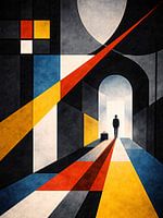 Een eenzame figuur beweegt zich door starre geometrische ruimten die worden gedefinieerd door scherpe lijnen en primaire kleuren, en suggereert beweging zonder zekerheid en aanwezigheid zonder erbij te…