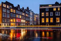 Een avondopname van de Oudezijds Voorburgwal in het centrum van Amsterdam. De voorbijgaande boten zorgen voor een mooie lijnenspel in de voorgrond.